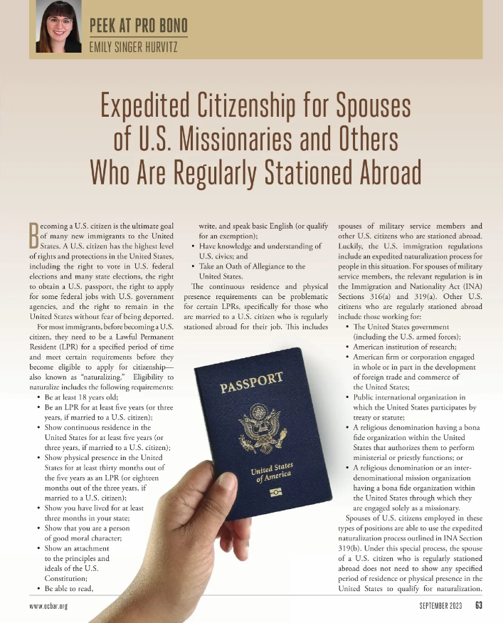 OC Lawyer Magazine featured my article about the expedited naturalization process for spouses of U.S. citizens employed or stationed abroad in the publication's Peek at Pro Bono column. I am honored to have my article about this unique area of immigration law featured. Check out my full article here for more information.